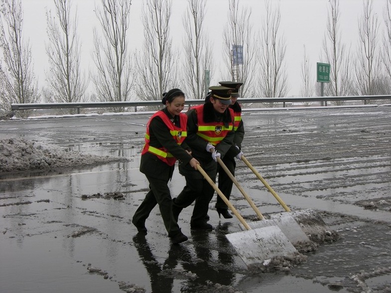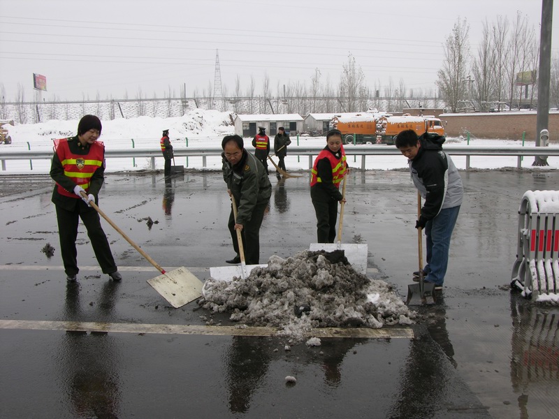 在除雪工作中,表現最為突出的李超、楊鑫兩位同志,發揚不怕苦、不怕累的過硬作風,一個勁兒地埋頭干活,被冰冷的雪水浸透的靴子也顧不得換。其他同志也不甘落后,揮舞著掃把和推雪板,斗志昂揚地投入到除雪工作中,特別是一些女同志,沒有絲毫的叫苦叫累,爭先恐后,忘我勞動,充分體現出了“巾幗不讓須眉”的豪情。